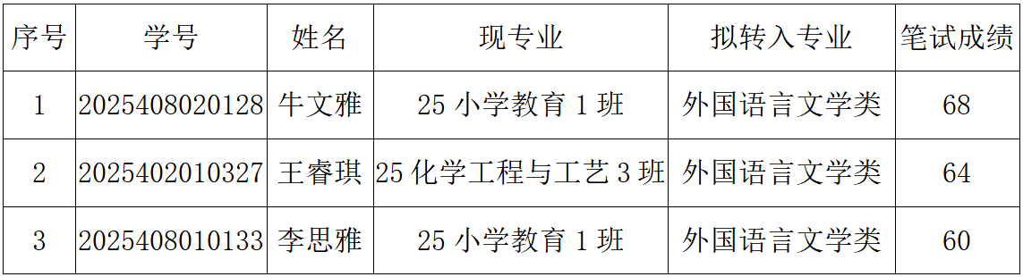 qy球友会2025年秋季学期期末转专业笔试考试已于2025年12月20日上午结束,现将笔试成绩进行公示。考生如有异议或有情况需要反映的,请以真实姓名向qy球友会教学科办公室电话、书面反映(电话0724-2313131),或到qy球友会教学科办公室与有关负责人面谈。现将笔试成绩公示如下:
