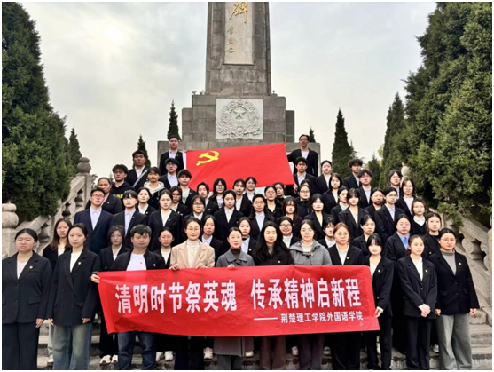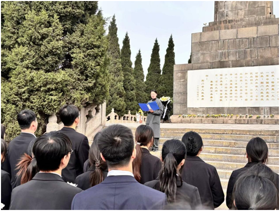 党委副书记王玥总结讲话,她勉励青年学子永葆赤子之心,传承先烈遗志,将爱国情怀转化为奋进力量。做红色基因的传播者,用英语讲好中国故事;做社会责任的践行者,让青春在乡村振兴、社区服务中绽放光彩。最后,全体党员面向纪念碑高举右拳,铮铮誓言穿透松涛,在山林间激起阵阵回响。
